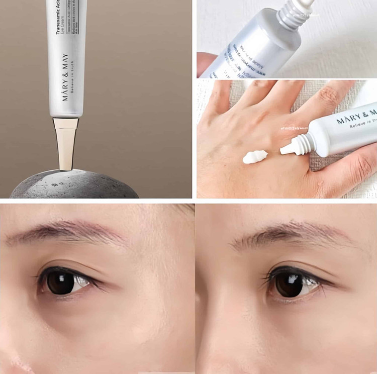 آنتی اکسیدان قوی گلوتاتیون و ترانکسامیک اسید با ویتامین C ترکیب شده سنتز ملانین را مهار می کند ، تیرگی لک ، کک و مک اطراف چشم را از بین میبرد و پوست را روشن و شاداب میکند