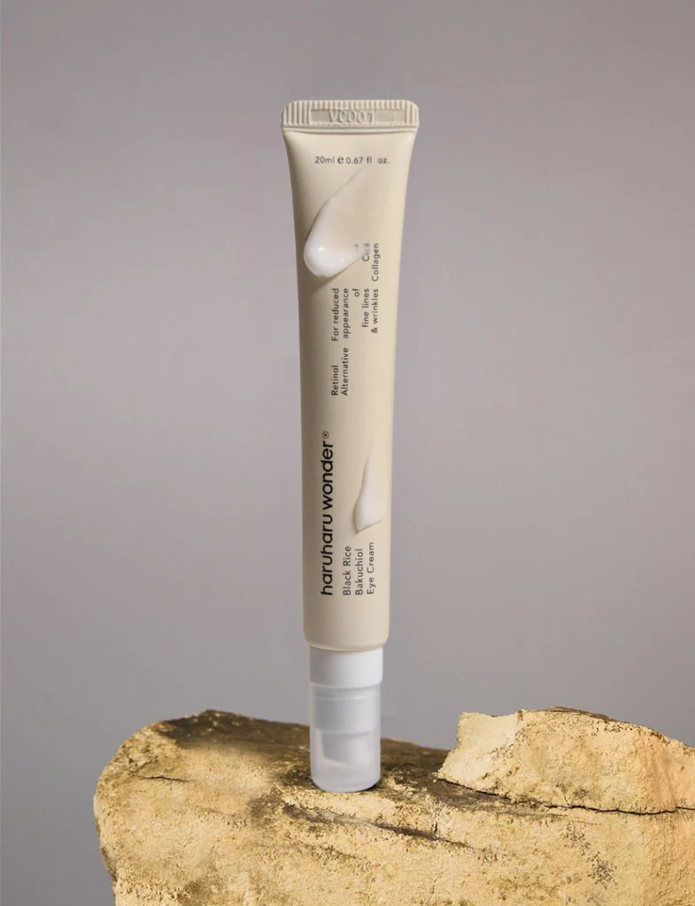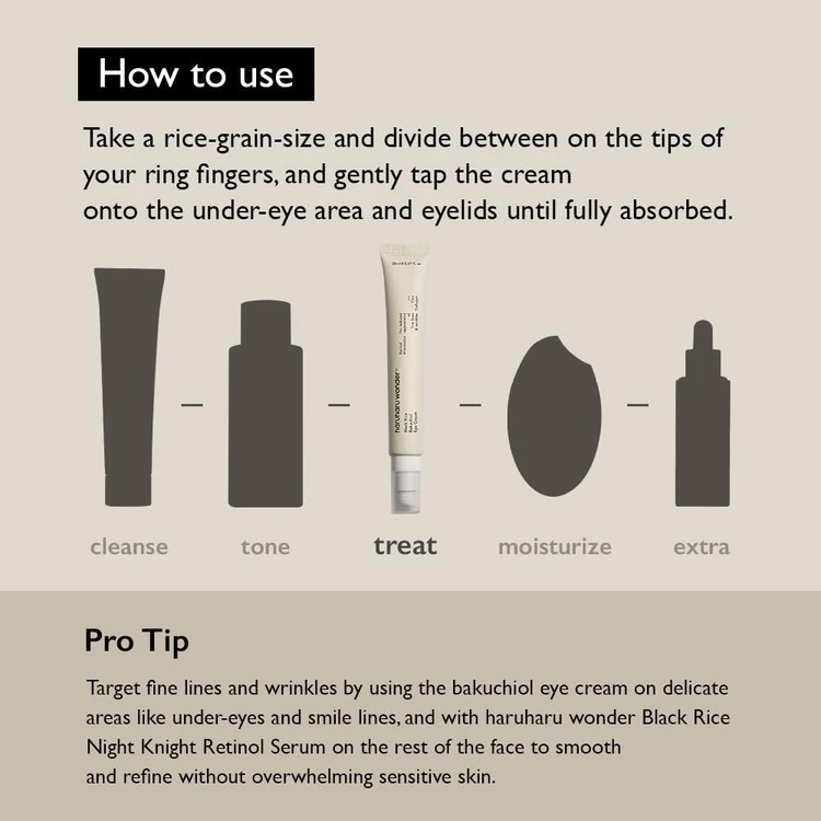 کرم دور چشم برنج سیاه haruharu wonder با برنج سیاه تخمیر شده، عصاره پوست درخت بامبو و باکوچیول مشتق شده از گیاه (مواد جایگزین رتینول) با غلظت 5000ppm، با چین و چروک دور چشم مقابله می کند.