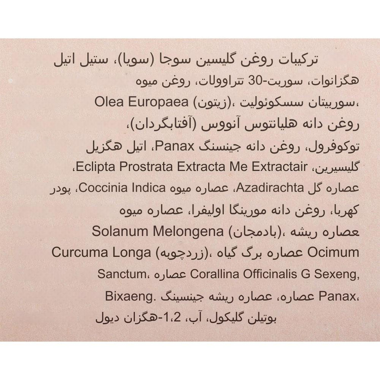 - حاوی 0.1 درصد روغن دانه جینسینگ با خاصیت آنتی اکسیدانی، ضد پیری و حفاظت از پوست در برابر محرک های بیرونی
