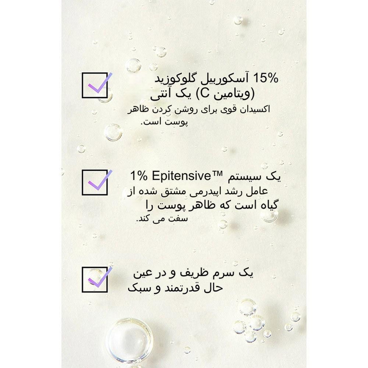 15 درصد فرمولاسیون این سرم اینکی لیست از ویتامین C یا همان گلوکوزید اکوربیل تشکیل شده است. ویتامین C یک آنتی اکسیدان قوی است و از این رو به خوبی از پوست شما در برابر آسیب های محیطی و آلودگی محافظت می کند. این ویتامین نقش بسیار زیادی در روشن شدن پوست شما نیز دارد.