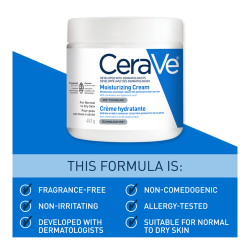 کرم مرطوب کننده چند کاره سراوی (CeraVe Moisturizing Cream 454g) حاوی سه فاکتور اساسی پوست یعنی سرامید برای جوانسازی و لیفتینگ، که موجب کشش بیشتر پوست شده و هیالورونیک اسید که برای آبرسانی و شفاف کردن پوست و درخشندگی پوست کاربرد دارد و آمینو برای کمک بیشتر در لیفتینگ و کشش پوست می باشد.